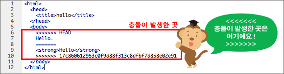 이때 이어붙여진 커밋 버전은 master의 HEAD와 충돌여부가 있기 때문에 이 부분을 수정해야한다.