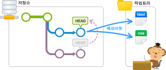 위의 이미지에서 HEAD가 보이는데 HEAD란 현재 사용중인 브랜치의 선두 부분을 나타내는 이름이다. HEAD를 이동하면 사용하는 브랜치가 변경된다.