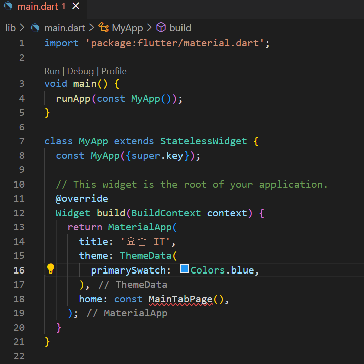 중요한 부분은 build 메소드이고, return을 Scaffold 메소드로 하게 되는데, Scaffold 메소드는 화면에 알맞게 배치되게 해주는 위젯이라 보면되겠다.