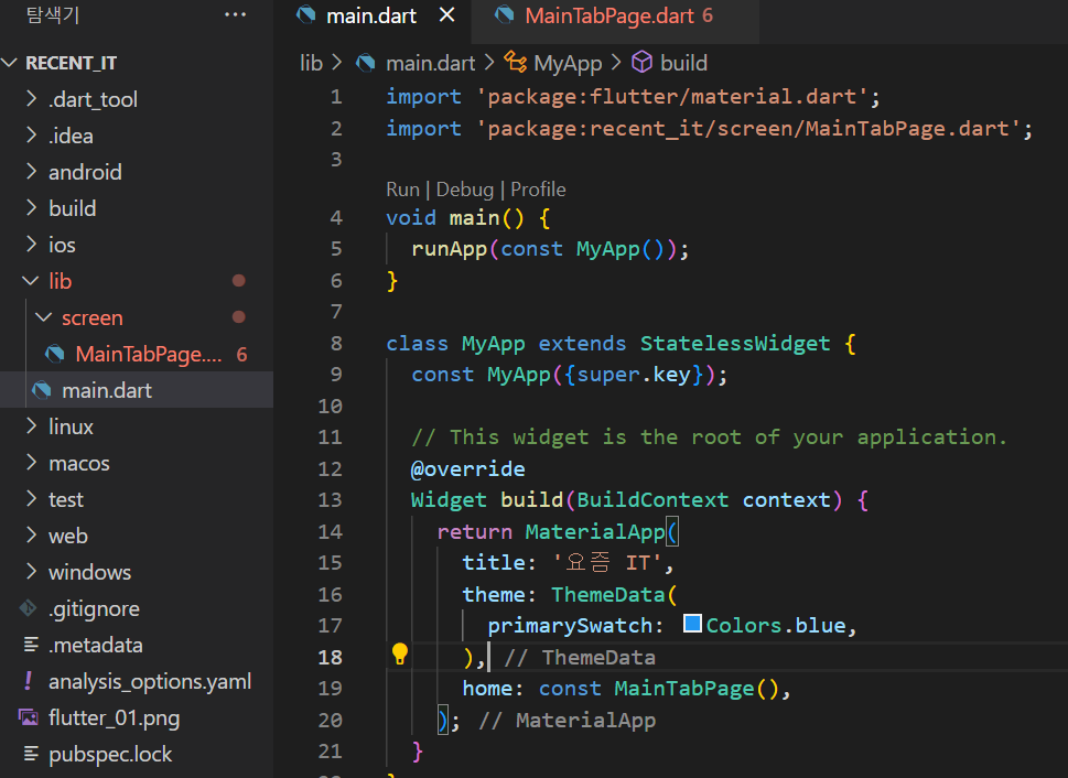 프로퍼티로 appBar와 body가 대표적이고, 앱바는 간단하게 요즘 IT를 기입해주었다. 일단은 디자인은 보류한 상태로 개발을 진행하고 추후에 디자인을 첨가하는 방식으로 프로젝트를 진행하도록 하겠다.