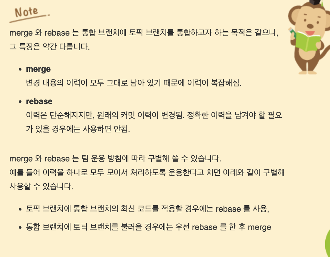 작업이 완료된 토픽 브랜치는 최종적으로 통합 브랜치에 병합된다. 브랜치 통합은 merge와 rebase를 사용하는 2가지 종류가 있다. 둘의 결과는 다르니 잘 알아보자