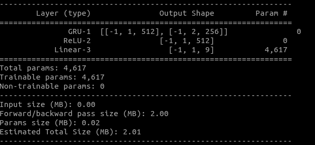 summary의 파라미터는 model과 인풋 사이즈입니다. 이때 배치와 시퀀스 길이는 1로 설정해야합니다. 이미지는 (채널 수, 이미지 사이즈)입니다.